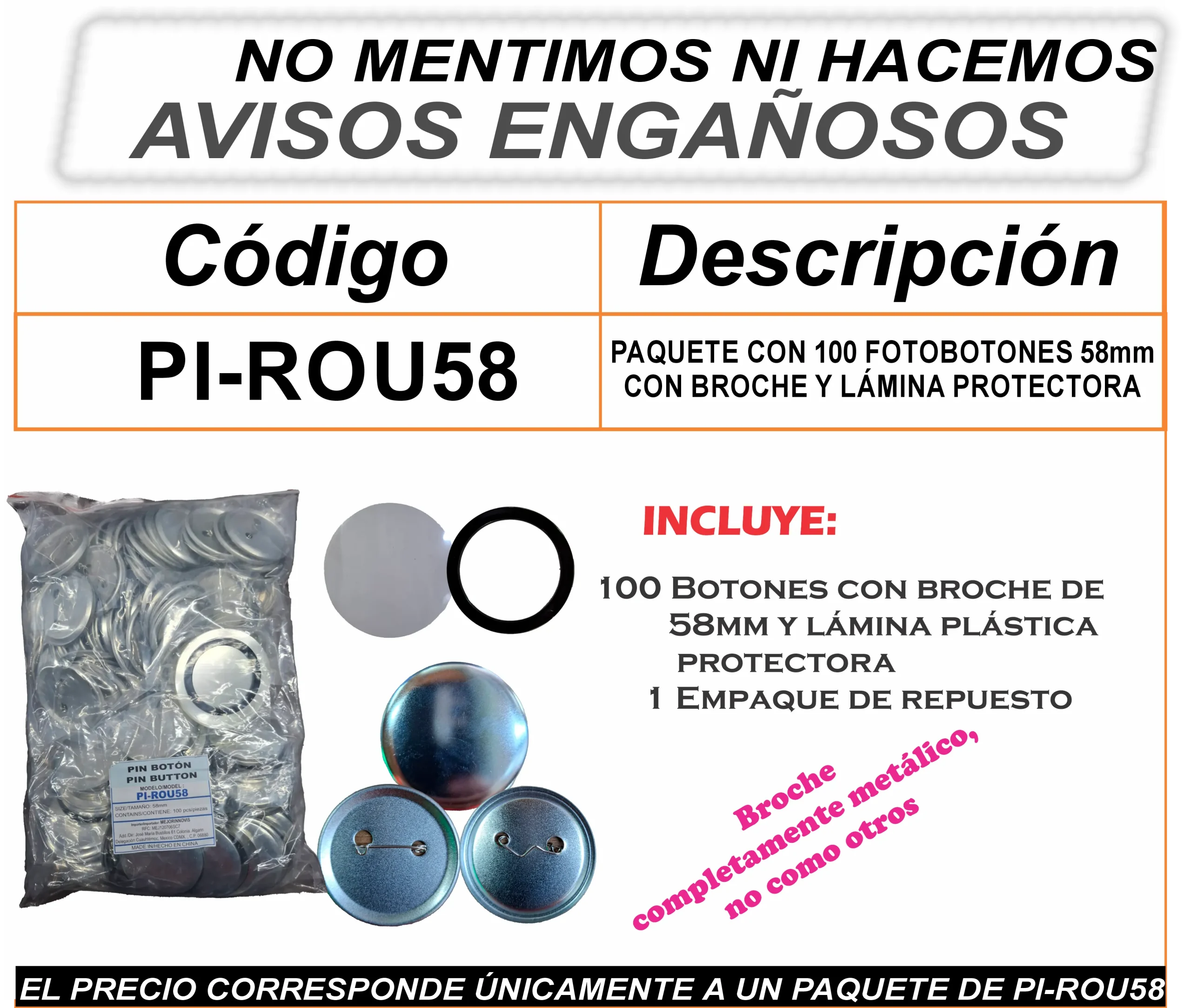 Código de producto: PI-ROU58 Material del producto: Metal Incluye: 1 Empaque de repuesto 100 Botones con broche totalmente metálicos 100 Láminas transparentes protectoras Ideal para realizar todo tipo de broches o pines especiales y novedosos para exposiciones, conferencias, salas de trabajo, escuela, campañas publicitarias, decoración, eventos especiales y muchas cosas más. Decore mochilas, bolsas, chamarras, playeras, cortinas, y cualquier otro espacio. Aumente sus ganancias incursionando con nuevo negocio o utilice de manera personal para diversión y creatividad con toda la familia.