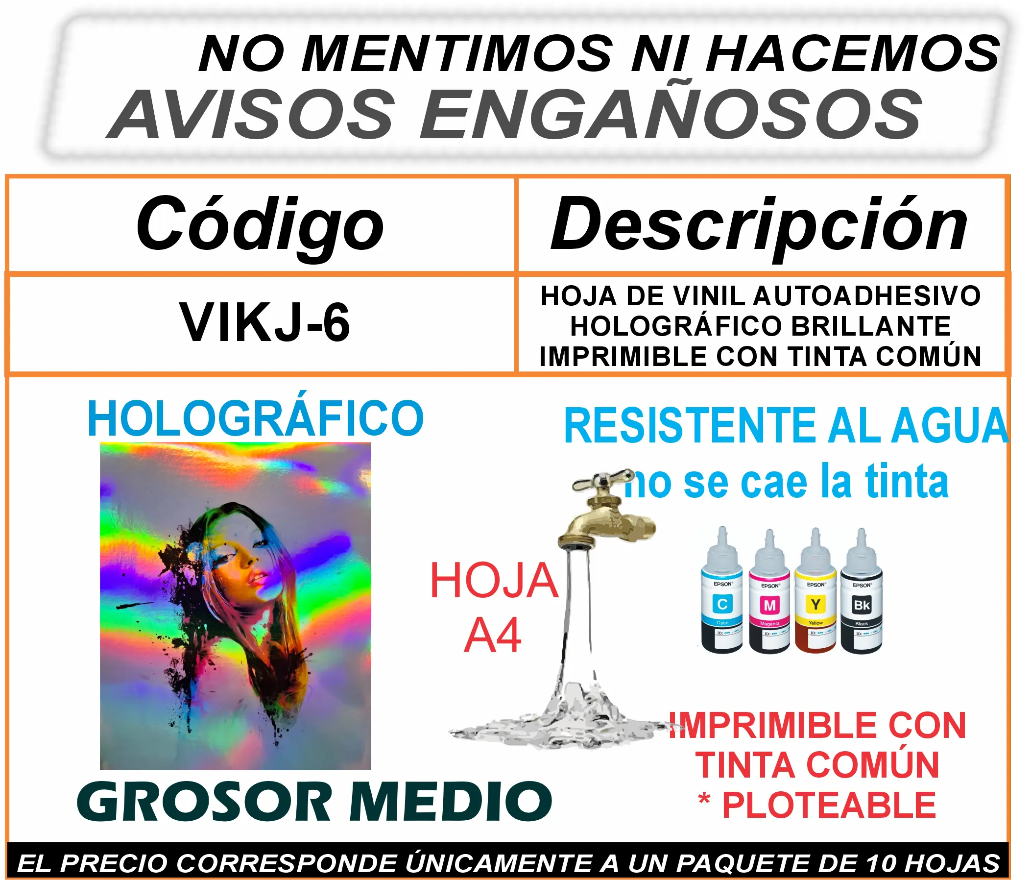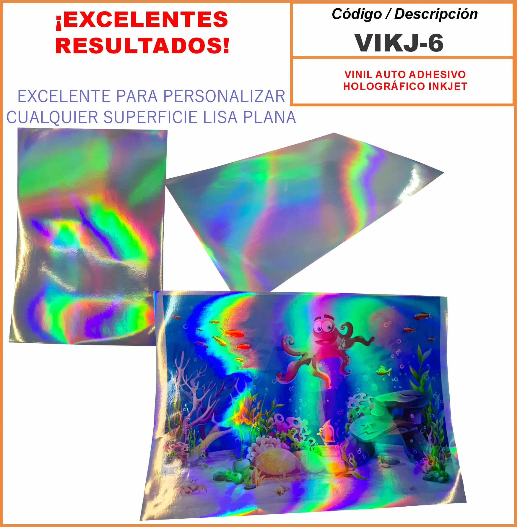 VIKJ-6, VINIL AUTOADHESIVO HOLOGRÁFICO IMPRIMIBLE TINTA COMÚN 10 HOJAS A4